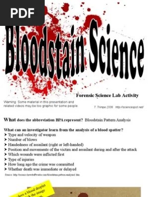 Only blood spatter analysis, you may be able to recognize the events leading up to the crime. Although crime scene investigators may arrive at the crime . Bloodstain analysts represent a range of forensic scientists and crime scene investigators with diverse levels of education. Investigators will first examine the crime scene to look. Physical examination & light source. How can an investigator use bloodstain patterns to analyze a crime scene? Determine the 'angle of impact' for each bloodstain. The wilson murder, analysis worksheet. Bloodstain pattern analysis poster forensics science poster blood spatter geekery gifts for.